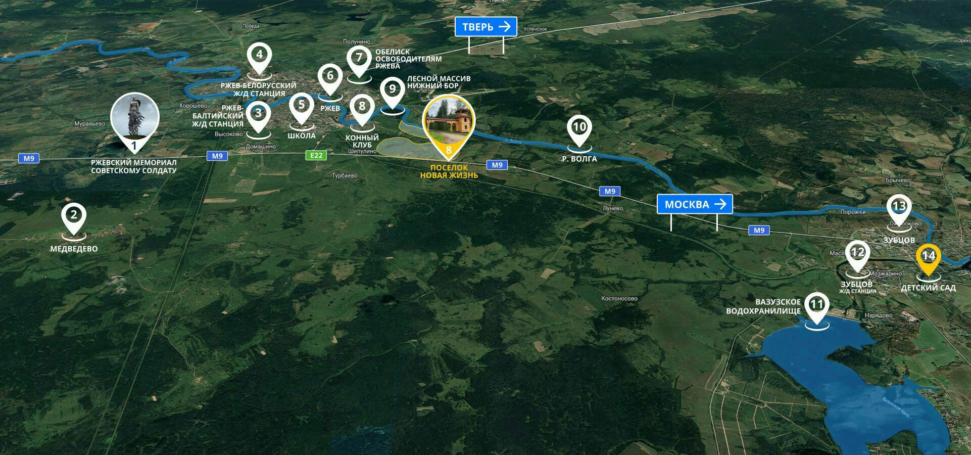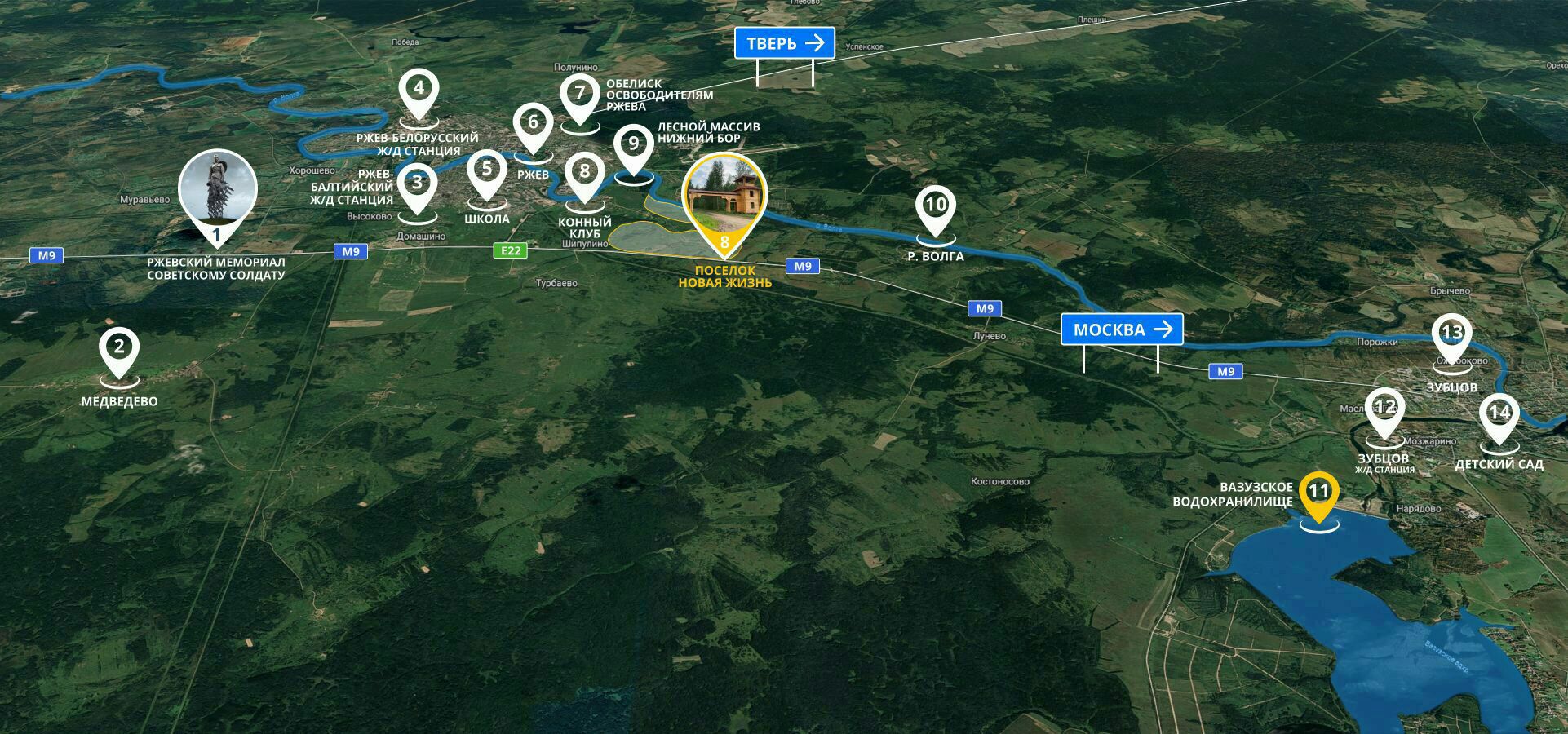 Поселок «Новая жизнь» находится в живописном и экологически чистом Ржевском районе Тверской области между деревнями Збоево и Появилово, неподалеку от впадения реки Большая Лоча в Волгу. Береговые участки расположены всего в 20-70 м от Волги. Поселок окружен смешанным лесом с грибами и ягодами. Рядом — река Вазуза. Здесь всегда чистая вода и отменная рыбалка. При этом инфраструктура города Ржева — всего в 15 минутах езды на автомобиле.